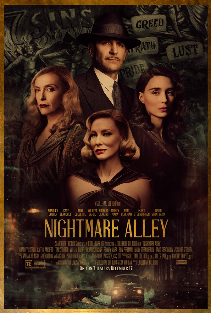 Running off with the circus seems like the perfect life and escape for Stanton Carlisle (Bradley Cooper); a straight edge down on his luck. But, with the right timing and the teachings of Zeena the Seer (Toni Collette) and Pete (David Strathairn), Stanton’s life launches as a Mentalist and Medium, assisted by his wife Molly (Rooney Mara). Enter femme fatal, Dr. Lilith Ritter (Cate Blanchett), the battle of mentalist vs. psychologist is afoot and holding onto one’s sanity is the prize, this is Nightmare Alley.