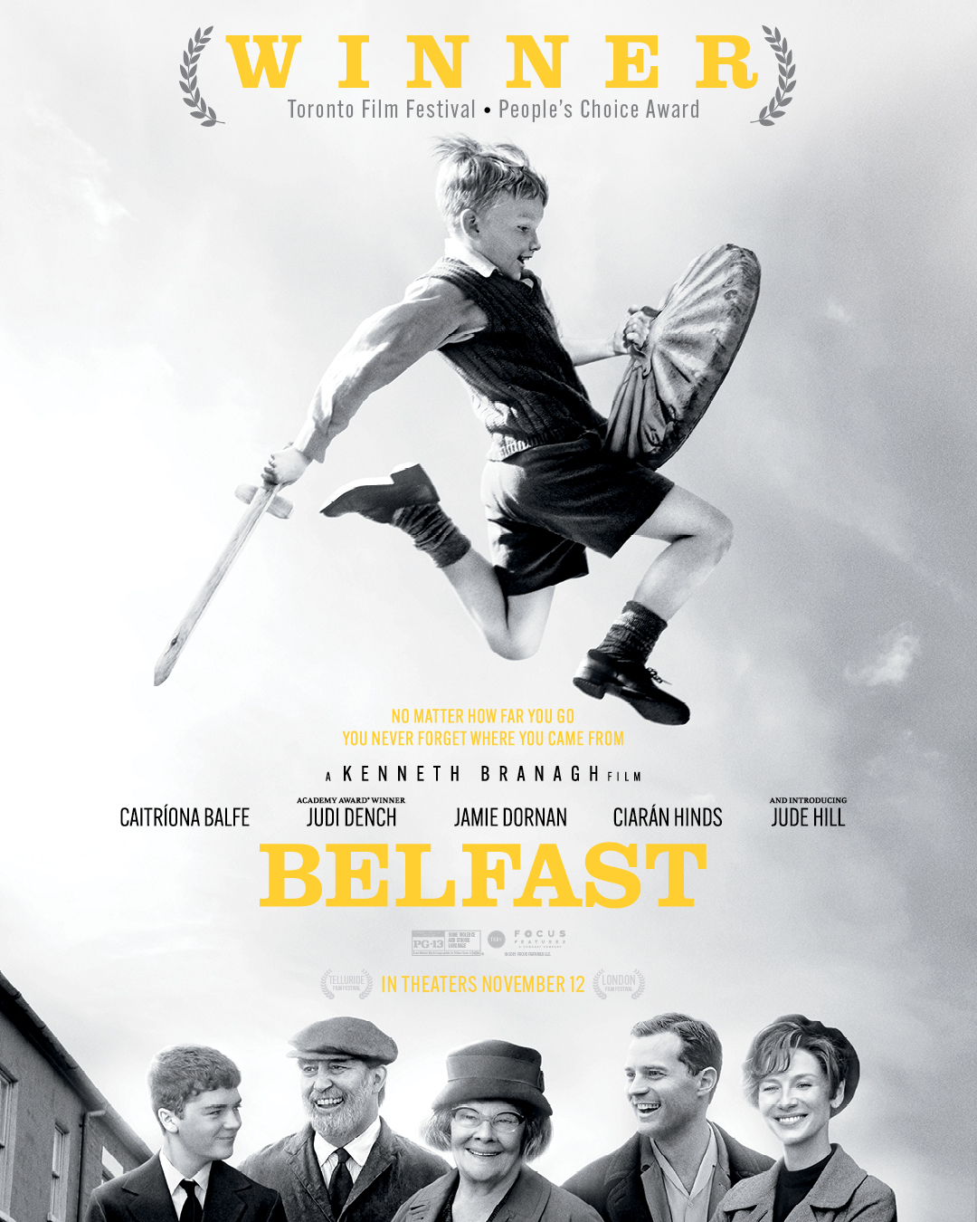 Northern Ireland in the late 1960’s sets the scene for Buddy (Jude Hill), a young boy growing up in a protestant home situated on a very catholic street. Challenged from all directions Buddy must find north on his internal compass in order to survive. Fortunately, his family is full of good wisdom. With luck, the teachings from his Ma, Pa, Granny and Pop (Caitriona Balfe, Jamie Dornan, Judi Dench, Ciarán Hinds) might be enough to coach him to success.